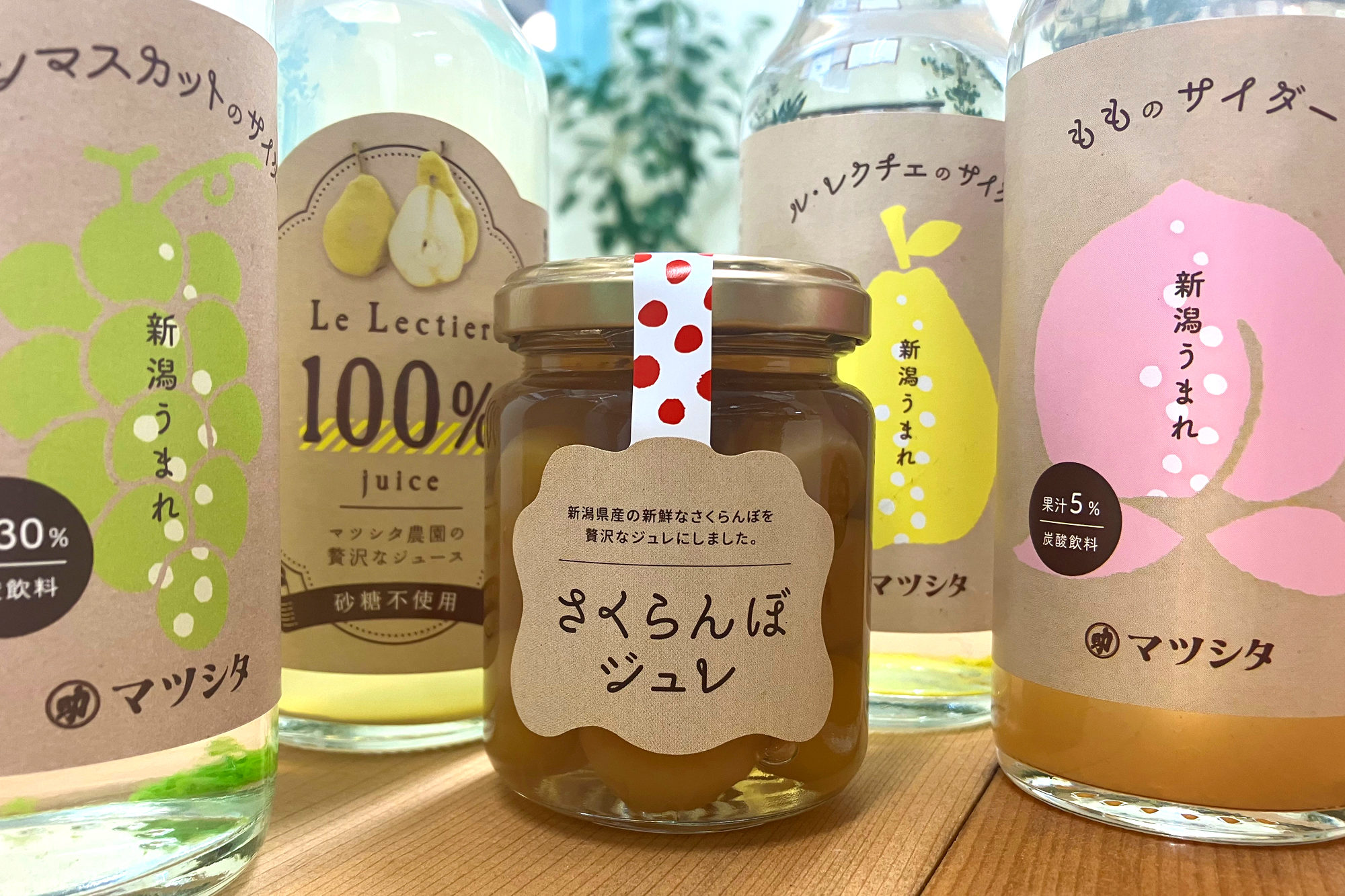加工商品の販売にあたりパッケージデザインでもお付き合いするようになってからは、「肥沃な土壌のおかげで美味しい果物が作れる」という松下さんの想いからメインカラーを茶色に設定し、デザイン展開をしていました。土っぽさや優しい雰囲気をクラフト紙で表現し、共通して使用していましたが、商品によっては高価なものであったり、新潟では珍しいさくらんぼを使ったもの、その度に「高級感を」「可愛らしさを」と変化をつけてデザインしていました。