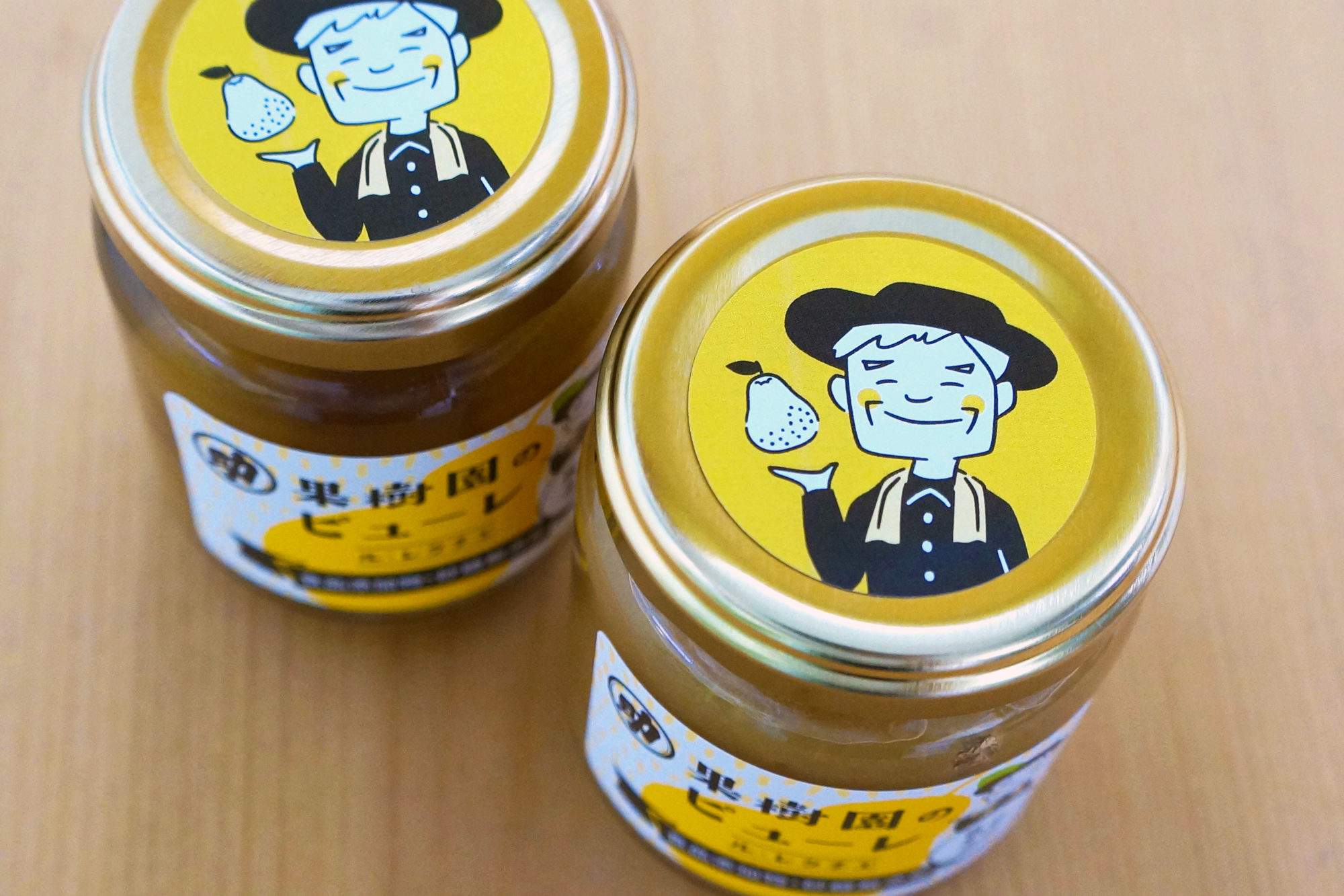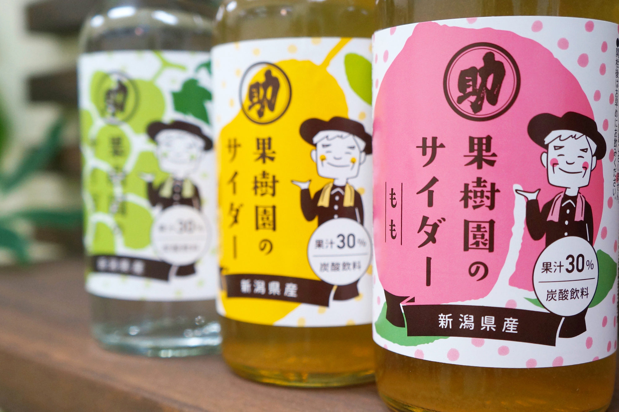 製造元でサイダーの瓶の形状が変わるということで、この機会にラベルのリニューアルと、デザインの統一を提案させていただきました。 「果樹農園が作っているとアピールする」ために名称を「〇〇のサイダー」から「果樹園の〇〇」にすることで、多数ある商品の展開に対応するネーミングに変更しました。また「優しい」イメージから「インパクト」を重視するデザインにシフトするため生産者さんを親しみやすいキャラクターにして展開していくことで印象付け、さらにリデザインした自社のロゴマークを大きく使い、信頼感を持ってもらうデザインにしました。