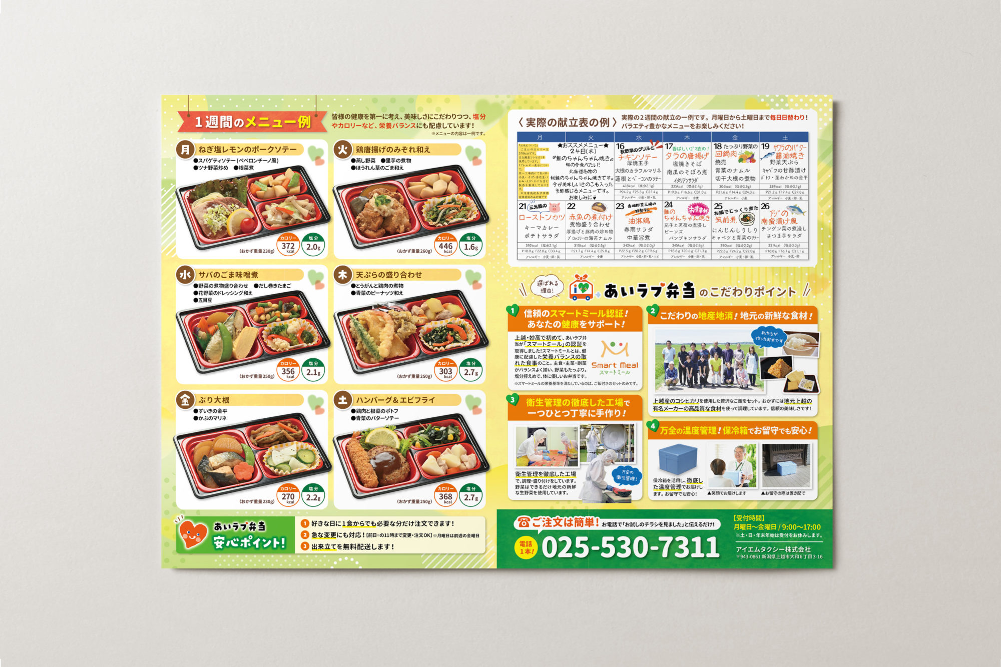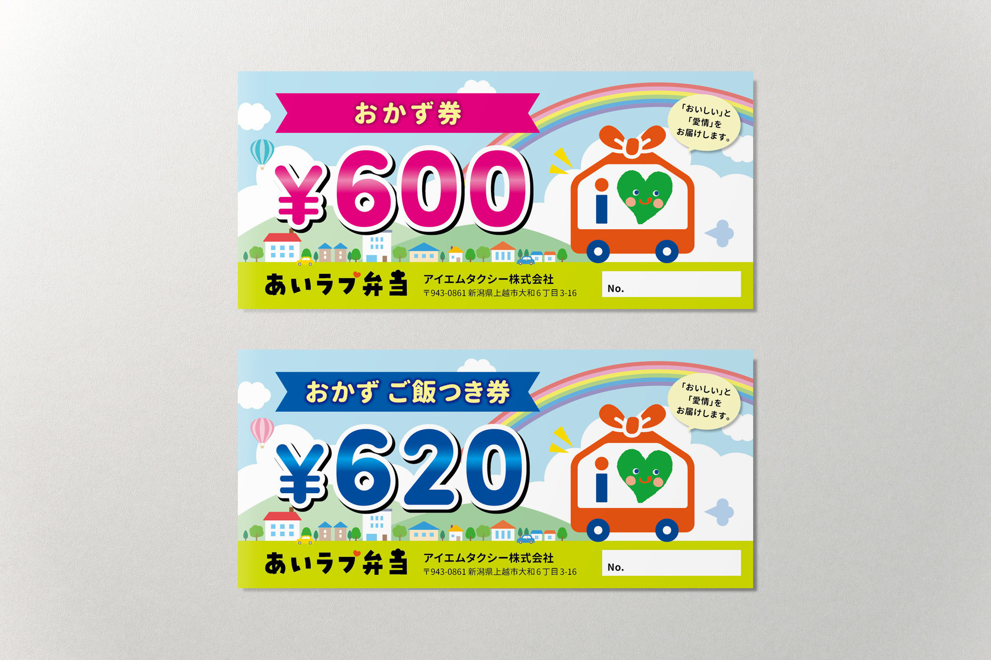 アイエムタクシー株式会社様のお弁当事業のロゴマーク、チケット、フライヤーのデザイン。アイエムタクシー様のロゴマークを活かして同じカラーリングでハートを入れたいという希望の元、お弁当の車でお客様の元へお届けするイメージでかわいく親しみやすくデザインしました。フライヤーにもハートを活かして、ターゲットの年配層のお客様に安心感を与える温かみのあるデザインにしています。
