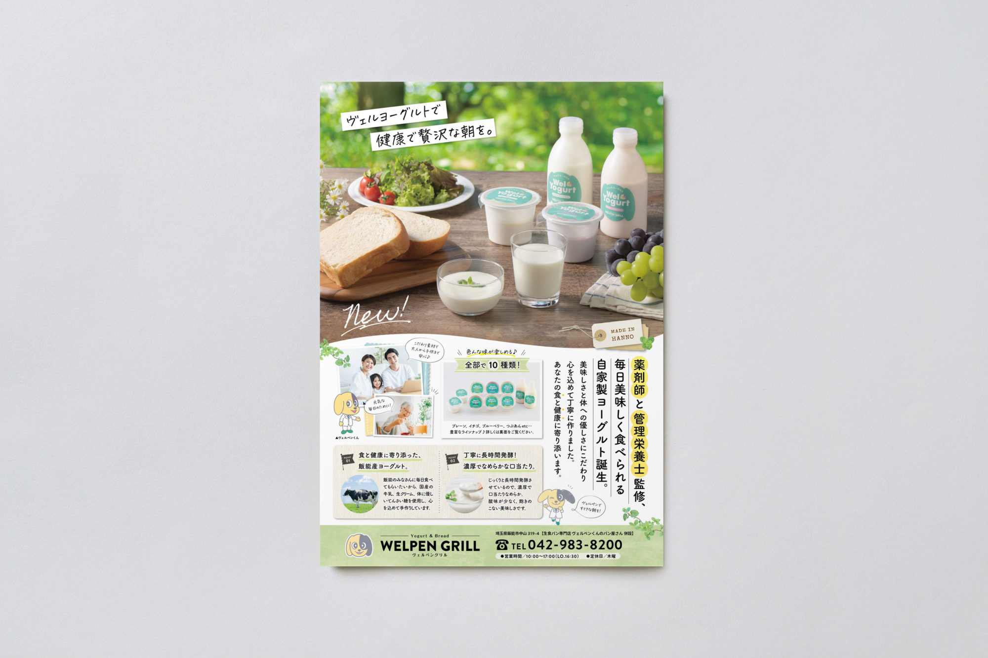 株式会社ヴェルペンファルマ様の「ヴェルヨーグルト」のフライヤーのデザイン。薬剤師と管理栄養士が監修した自家製ヨーグルトです。ナチュラルなイメージで爽やかに健康的にデザインしました。