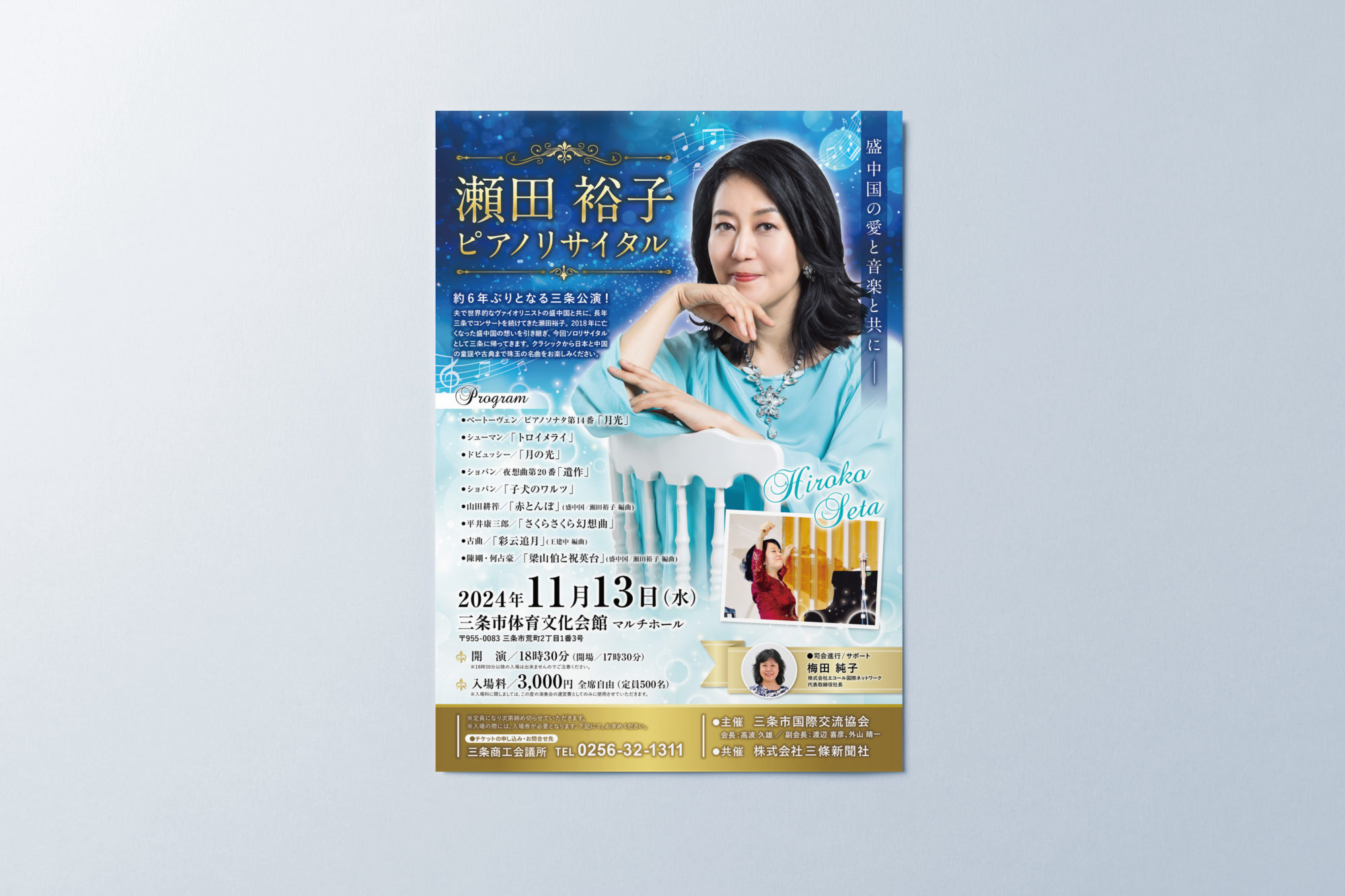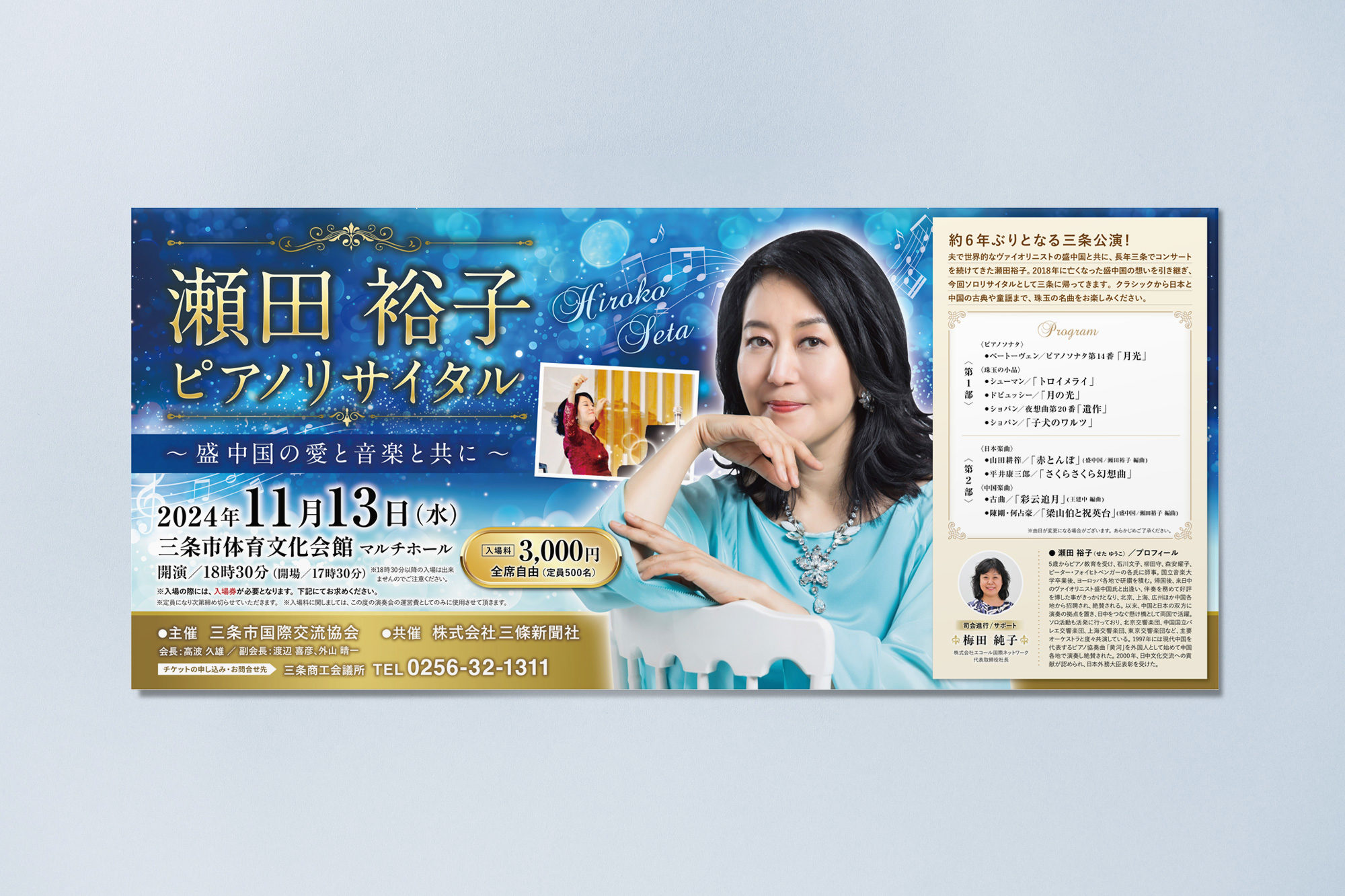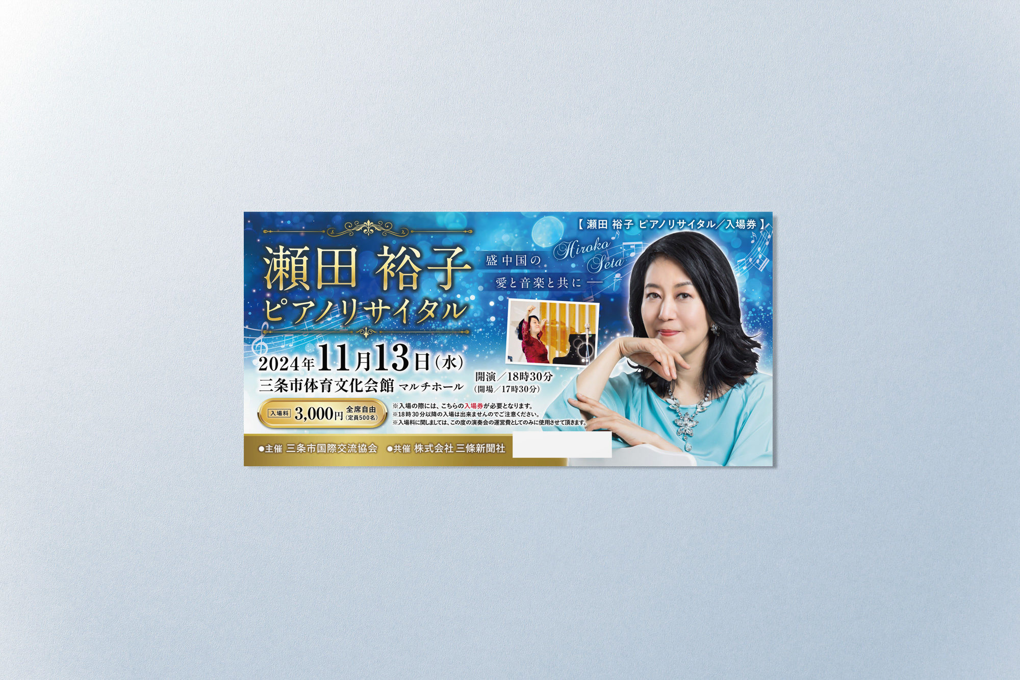 ピアニストの瀬田裕子さんのピアノリサイタルのフライヤー、新聞広告、チケットのデザイン。リサイタルの特別なひとときを感じられるよう、キラキラとした華やかな雰囲気を大切に仕上げました。
