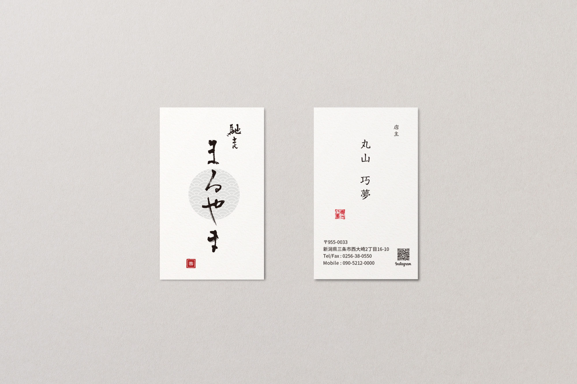 割烹 馳走まるやま様のロゴと名刺のデザイン。魚料理を得意とされる店主に合わせて、水の流れを感じさせるような細身の筆文字を使用し、格調の高さと割烹料理にふさわしい落ち着きのある雰囲気に仕上げました。